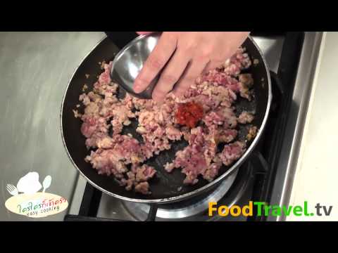 4. กะทะ+ น้ำมัน ตั้งไฟอ่อน เทให้น้ำมันเคลือบกะทะให้ทั่ว รอให้กะทะพอร้อน (ถ้าน้ำมันมากให้เทออก) ตัก 1 ทัพพี หยอดกลางกะทะ ยกกะทะกรอกร่อนให้เป็นวงกลม รอให้สุก กลับด้าน ตักใส่จาน ตัดไข่เป็นสี่เหลี่ยมผืนผ้า (ใช้ด้านไข่ที่เรียบอยู่ด้านในที่ห่อ) + ไส้เนื้อหมูกุ้งสับ ห่อไข่ ลักษณะม้วน พับซ่อนปลายให้เรียบร้อย (ขนาดสี่เหลี่ยมจตุรัส 1x1”) + วางบนหน้าไข่ด้วย ใบผักชี พริกชี้ฟ้าแดงเส้น
