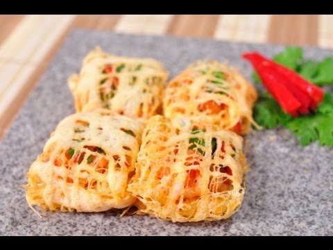 4. กะทะ (แบน) เช็ดด้วยน้ำมัน ตั้งไฟอ่อน รอให้กะทะร้อน ตักไข่ใส่ที่โรย (ฝอยทอง) โรยไปมาเป็นตาข่าย รอให้สุก กลับด้าน ตักใส่จาน ตัดไข่เป็นสี่เหลี่ยมผืนผ้า (ใช้ด้านไข่ที่เรียบอยู่ด้านในที่ห่อ) + พริกชี้ฟ้าแดงเส้น ผักชี ไส้กุ้ง ห่อไข่ ลักษณะม้วน พับซ่อนปลายให้เรียบร้อย (ขนาดสี่เหลี่ยมจตุรัส 1x1”)